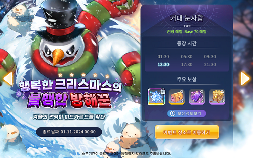 이벤트 내용 : 프론테라 서문에 특정 시간이 출현하는 필드보스 “거대 눈사람”을 사냥하여 특별한 보상을 얻을 수 있습니다.