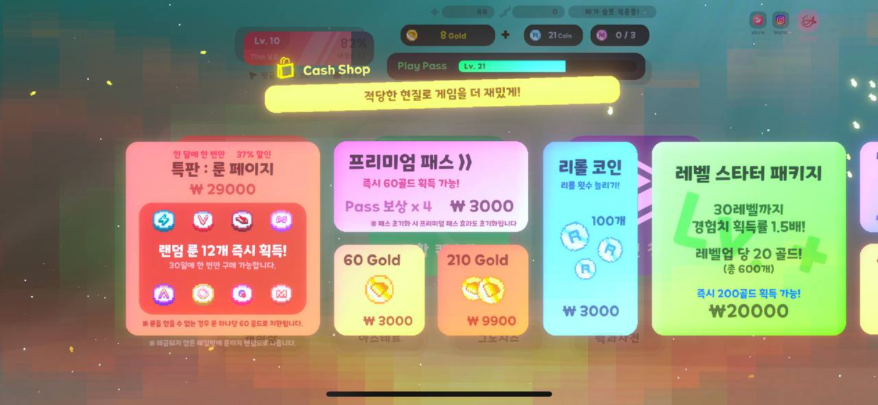 다양한 상품들이 있고 게임을 편하게 즐기고 싶으신 분들은 하셔도 될 것 같습니다. 프리미엄 패스가 3000원 밖에 안 하기에 큰 부담은 없습니다.