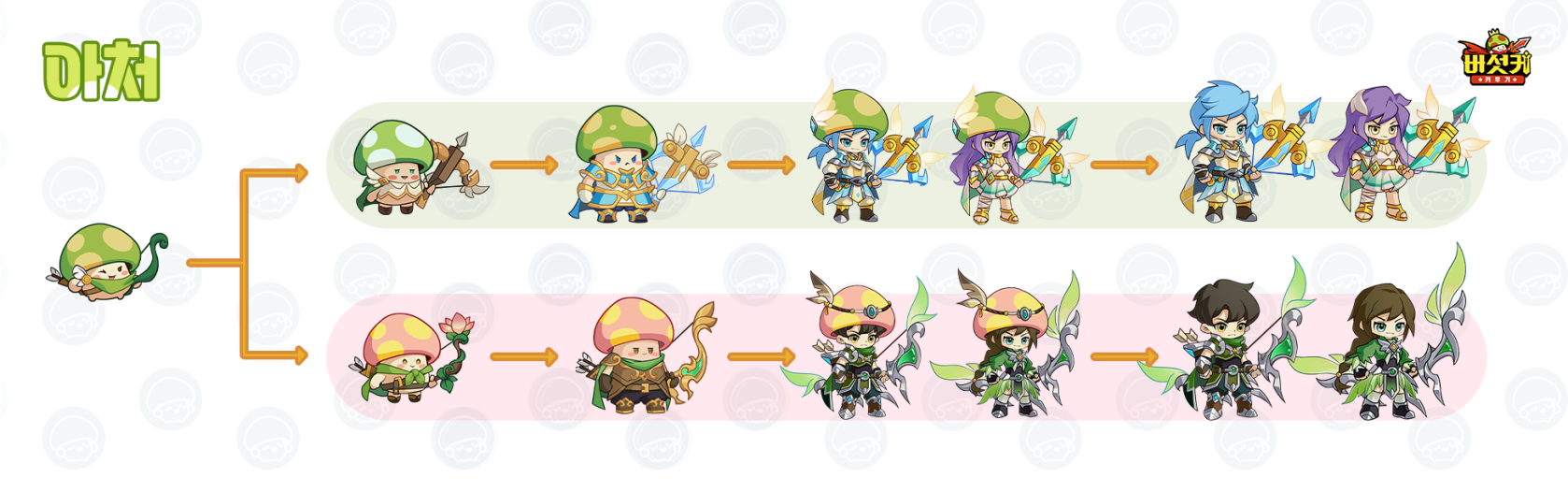 레인저 계열로 2~4차 전직까지 활을 사용하는 직업과 석궁을 주로 사용하는 직업으로 나누어져 있습니다.
