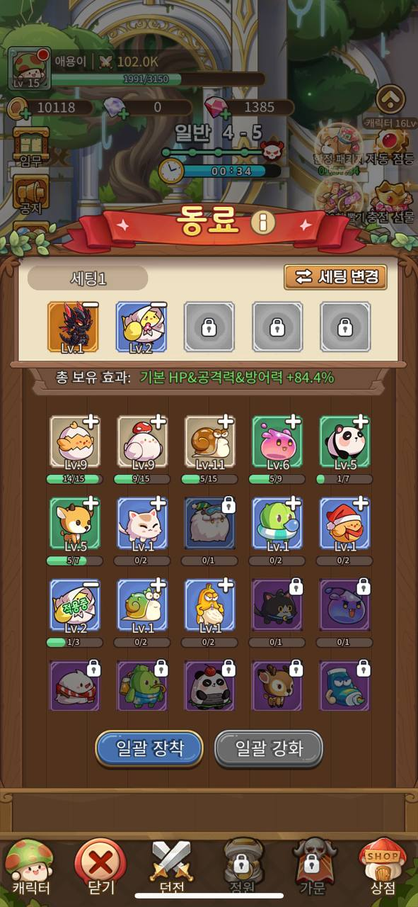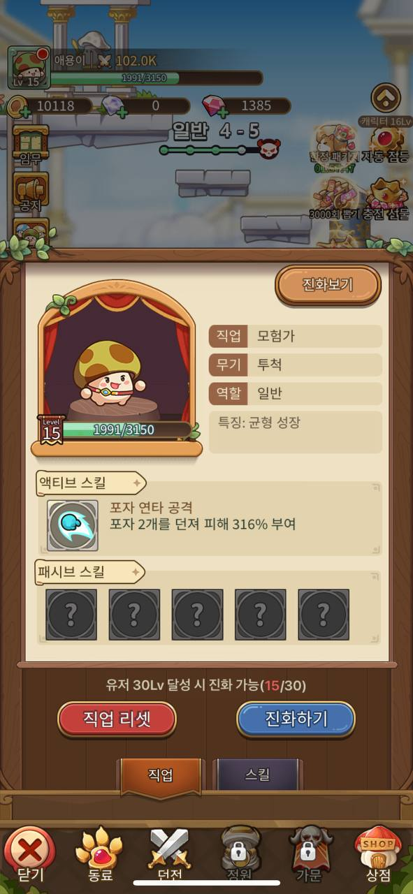 기본적으로는 스테이지를 클리어하면서 버섯인 주인공과 동료들을 모으고 스킬 및 아이템을 통해 성장하는 게임입니다.