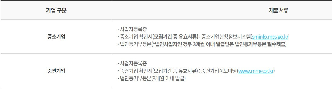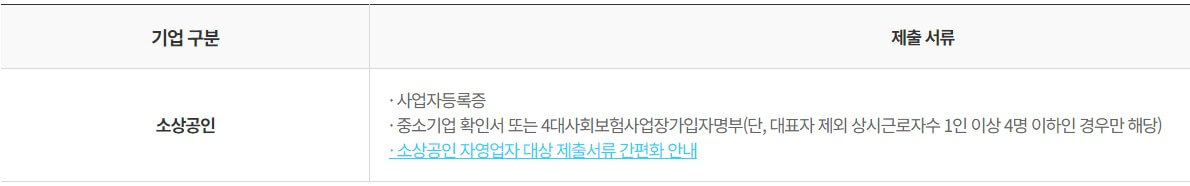 - 중소기업 확인서 또는 4대 사회보험사업장가입자 명부(해당 경우는 대표자 제외 상시근로자 수가 1인 이상 4명 이하인 경우에만 제출)