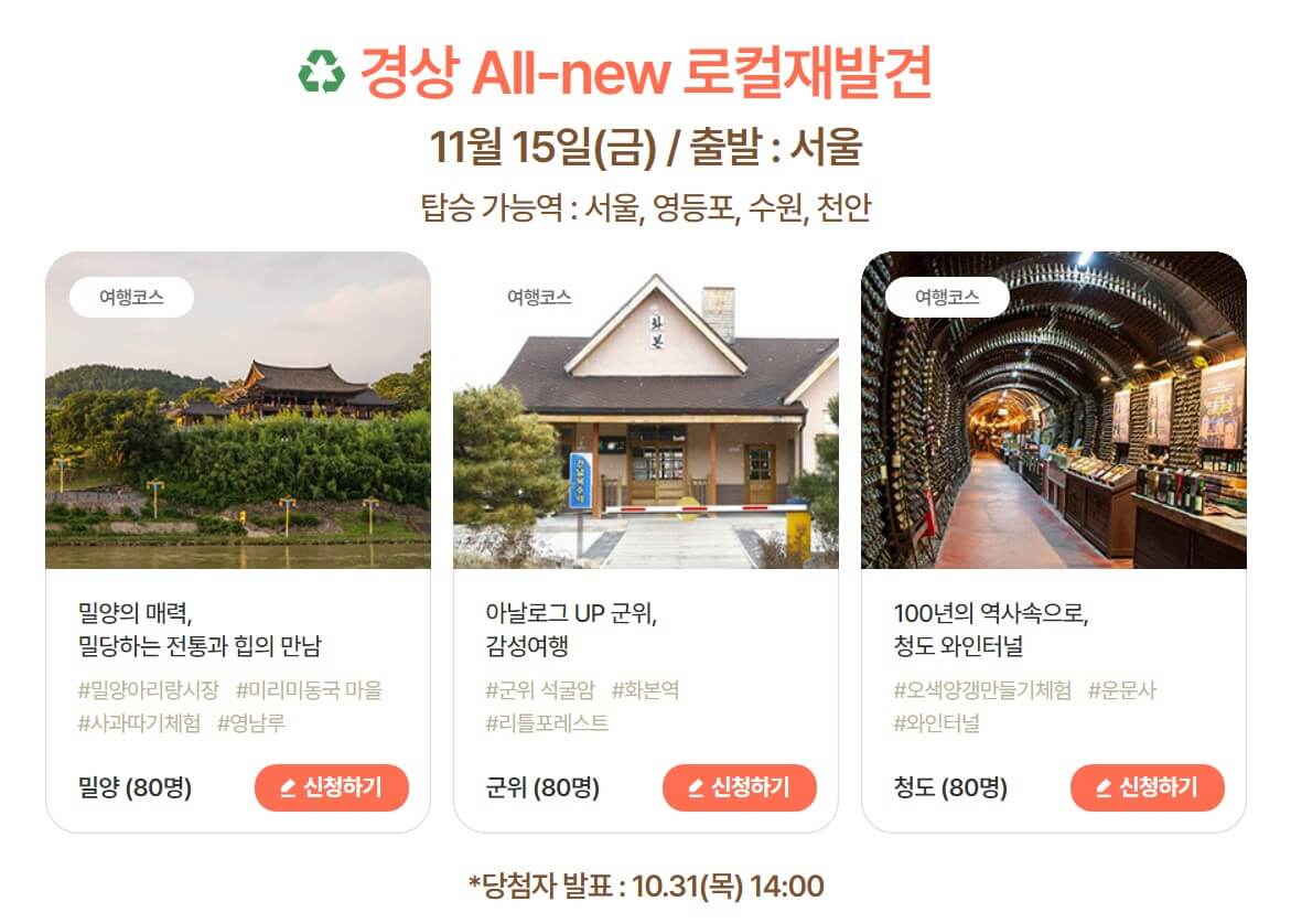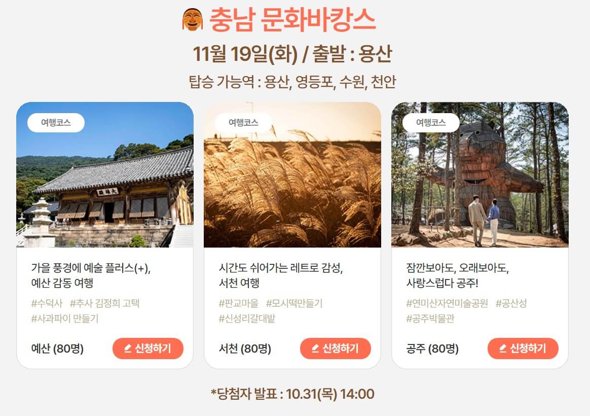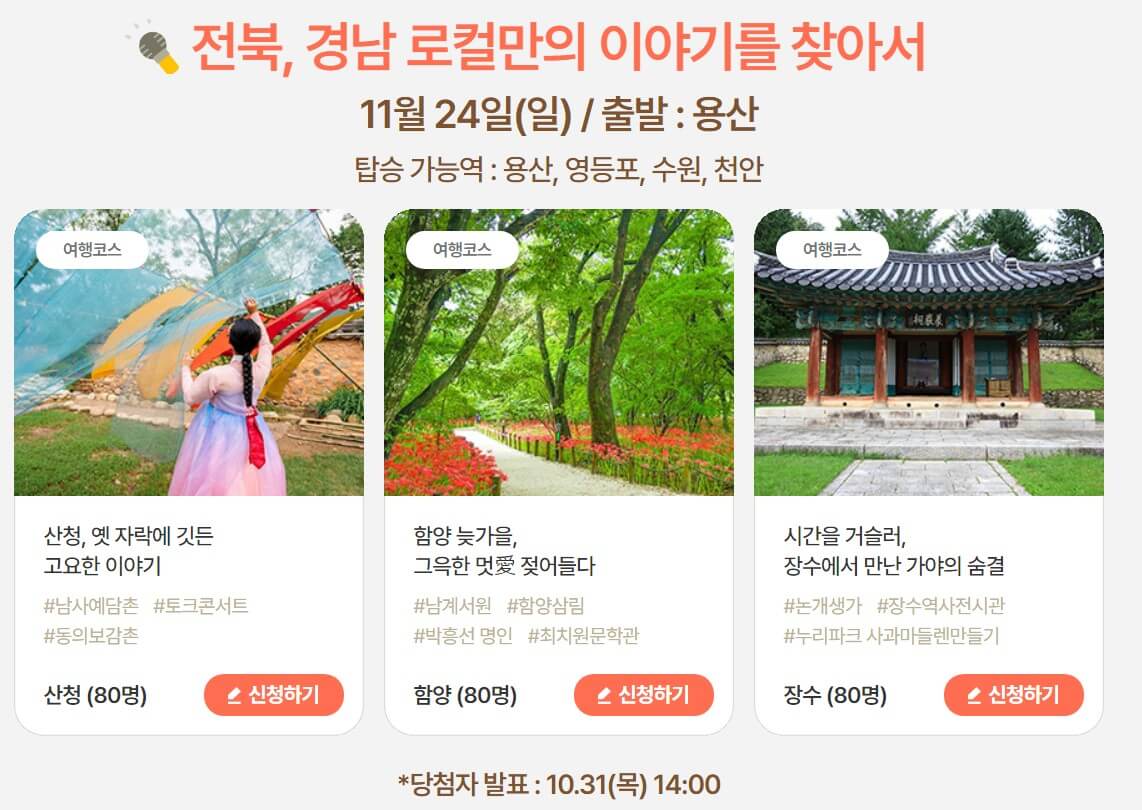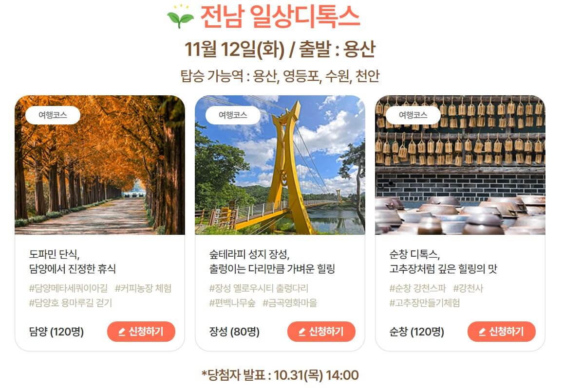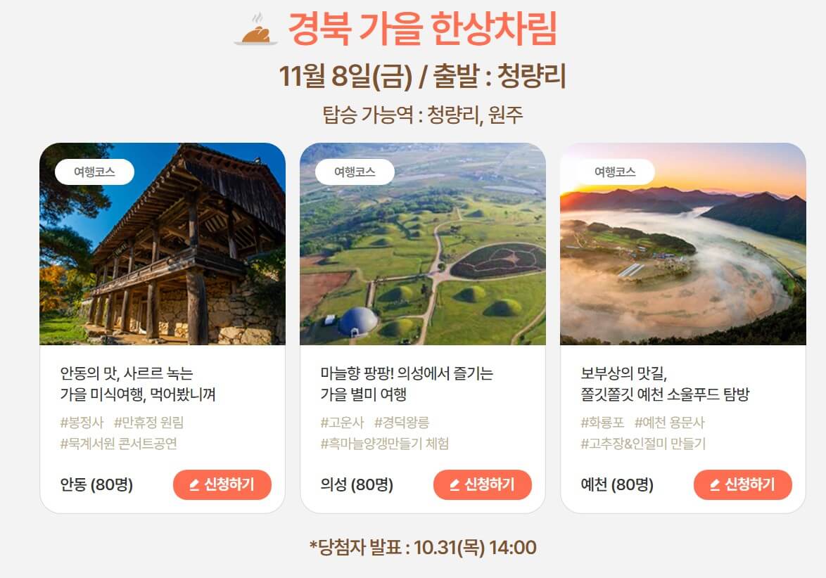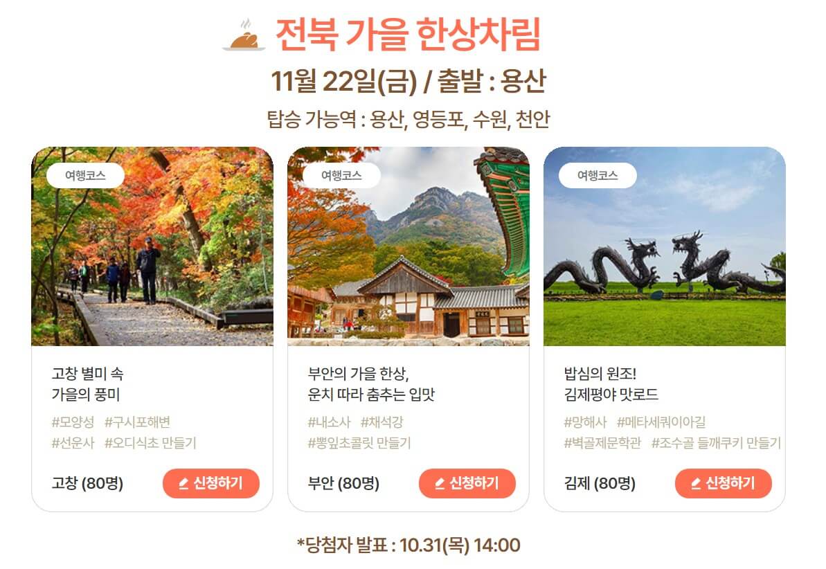 - 신청 방법: 대한민국 구석구석 공식 웹사이트(여행 가는 가을 홈페이지)를 통해 신청 가능하며, 추첨을 통해 참여자가 선정됩니다.