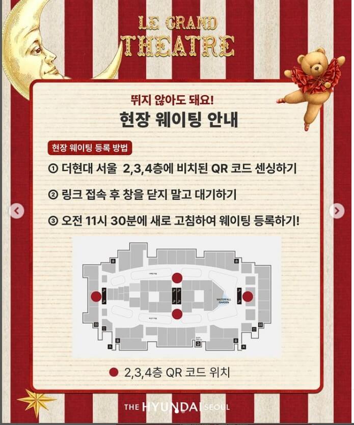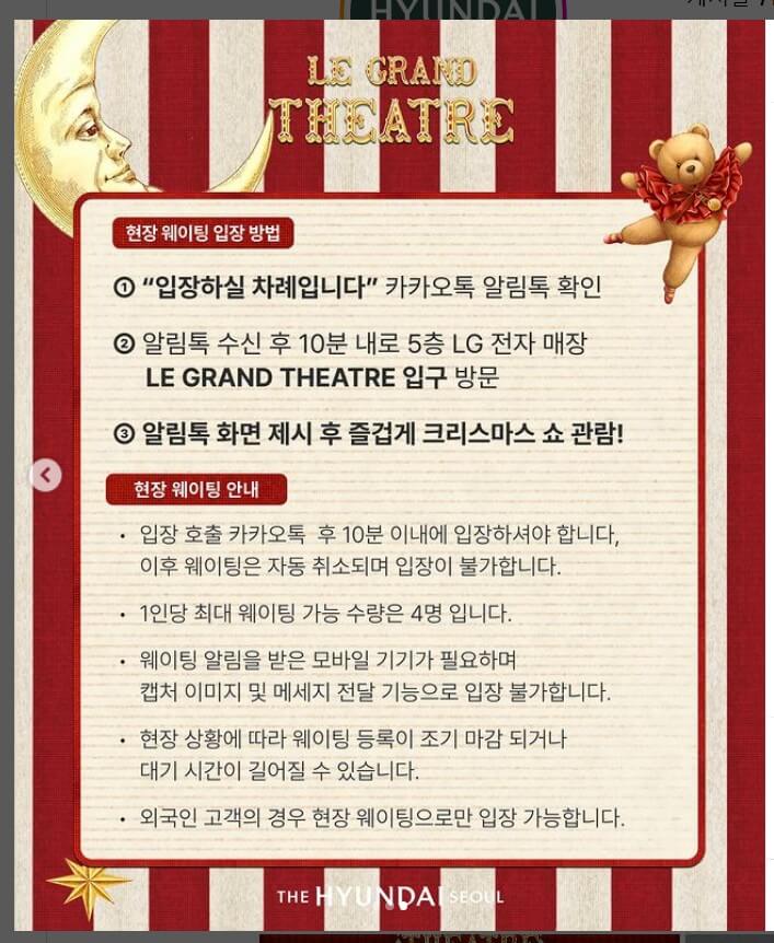 - 현장 예약: 온라인 사전 예약을 놓치셨더라도 현장 웨이팅을 통해 입장이 가능합니다. 방문 당일 더현대 서울 2, 3, 4층에 비치된 QR 코드를 스캔하여 웨이팅을 등록하시면 됩니다. '입장하실 차례입니다'라는 카카오톡 알림을 받으신 후 10분 이내에 5층 LG 전자매장 LE GRAND THEATRE 입구로 가셔서 입장하시면 됩니다.